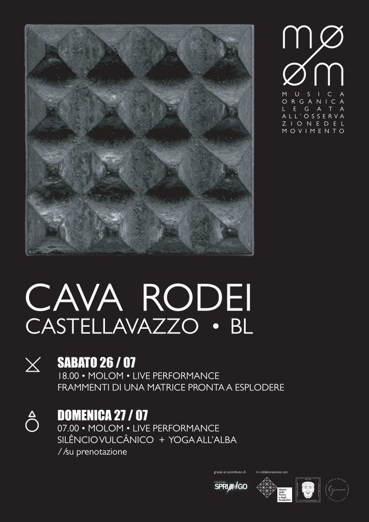 “Frammenti di una matrice pronta a esplodere”, questo il titolo della performance, unisce l’arte della scultura e le sue gestualità con l’elaborazione del suono in tempo reale attraverso una live performance di 30 minuti in cui la pietra diventa materiale d’incisione, sia musicale che fisicamente tangibile. Il parallelismo tra pieno e vuoto evidenzia come la scultura, arte del levare, riveli forme nascoste, mentre il suono si manifesta attraverso i vuoti creati. Questo dialogo tra levare e aggiungere crea una tensione che invita a riflettere su le dicotomie assenza / presenza, silenzio / rumore. Le performance di Molom sono esperienze che abbracciano l’interconnessione tra le arti visive e la sound art, creando un dialogo vibrante tra due forme d’arte che fanno parte del background dei due performer.